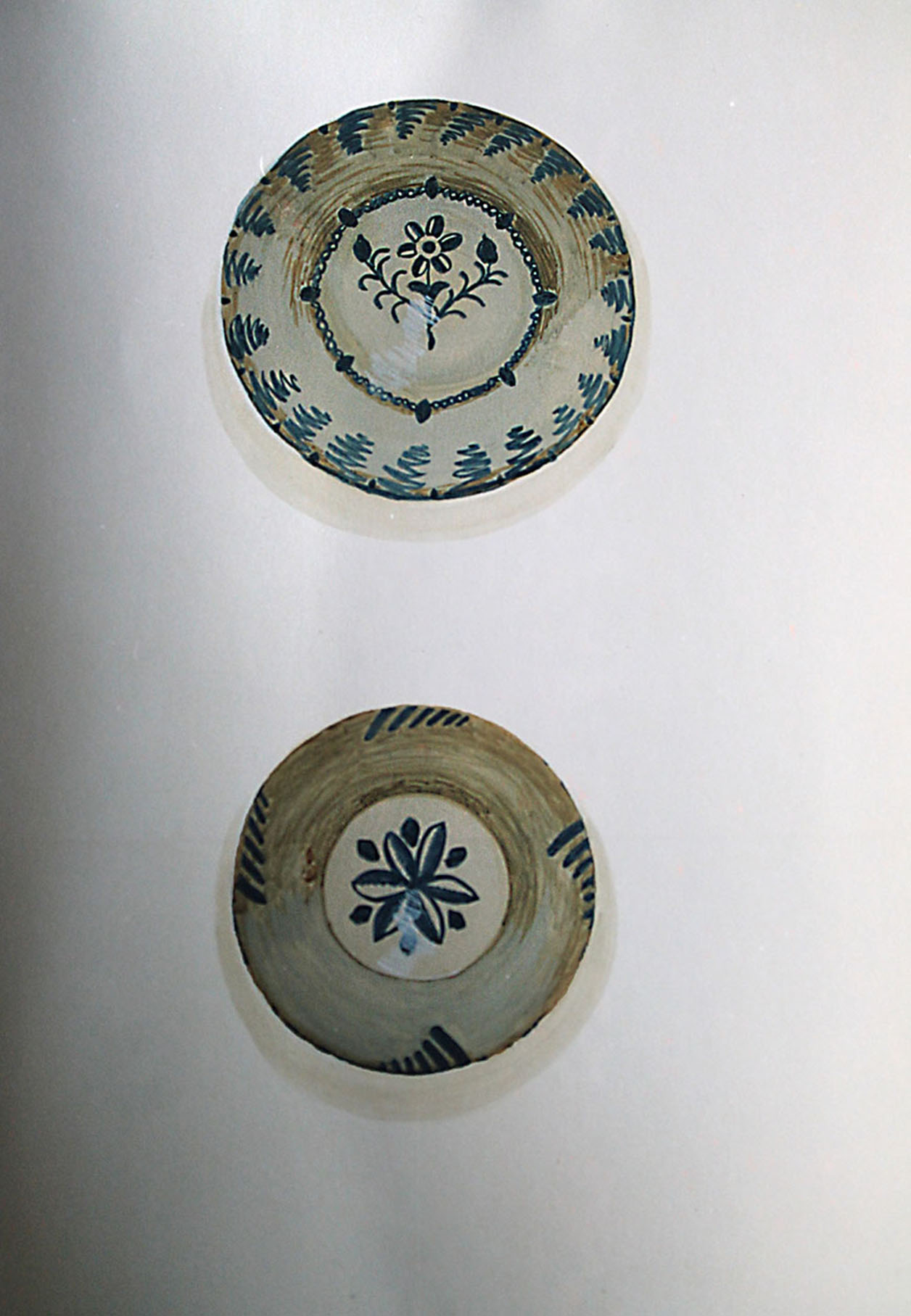 Estos platos los pinté por encargo en la pared de un comedor en una casa particular. La pared estaba pintada con temple blanco y los platos los pinté a mano alzada con gouache y toques de tempera y los cubrí con barniz para carboncillo, para darles un poco de protección. Los marcos de los cuadros a cada lado de los platos eran de escayola blanca y les pinté una imitación de madera con pintura al óleo después de aplicarle un par de capas de semi-laca blanca satinada. Los marcos los barnicé con barniz de poliuretano satinado de un componente.